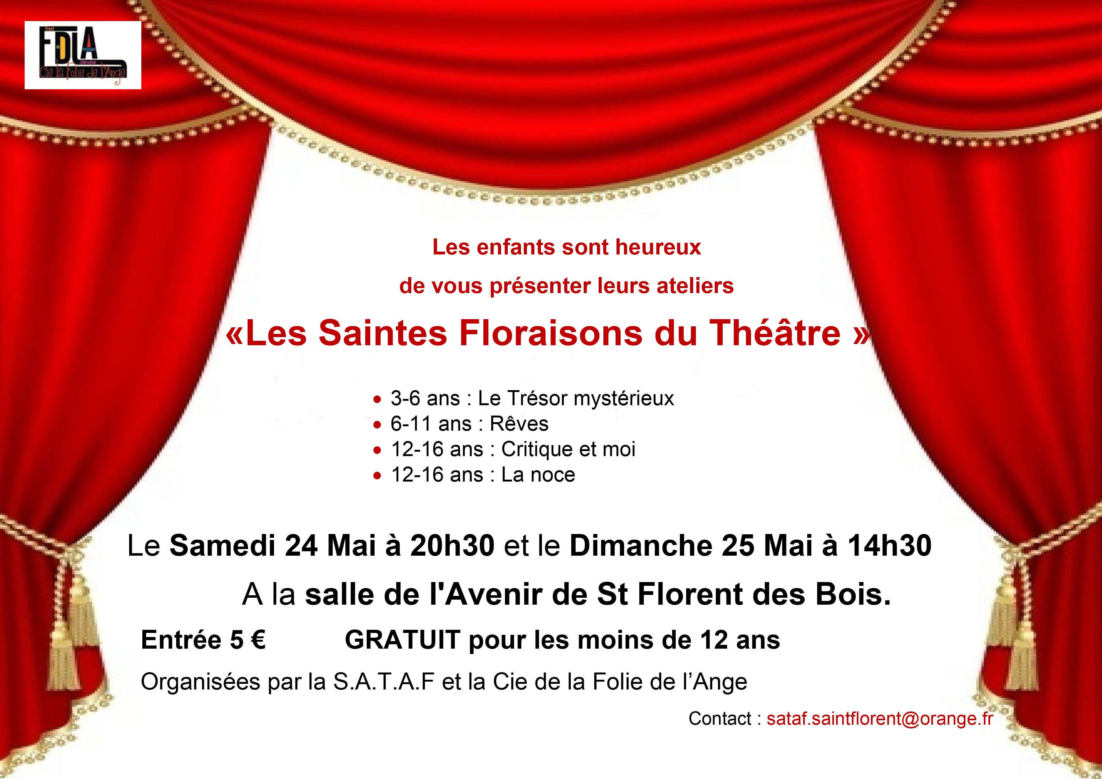 Soirées théâtre à Saint Florent des Bois : Les Saintes Floraisons du Théâtre 9 Mai 2014 · par Asso La Clé des Champs · dans Culture, infos. · Le Samedi 24 Mai à 20h30 et le Dimanche 25 Mai à 14h30 A la salle de l’Avenir de St Florent des Bois. Entrée 5 € GRATUIT pour les moins de 12 ans Partager : Cliquer pour partager sur X(ouvre dans une nouvelle fenêtre) X Cliquez pour partager sur Facebook(ouvre dans une nouvelle fenêtre) Facebook J’aime chargement… Sur le même thème