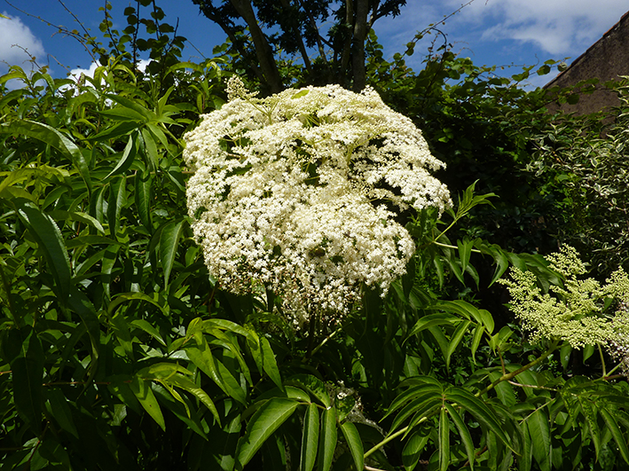 Nous arrivons à la mi juillet et voici que s’épanouissent les ombelles géantes (diam 35cm) d’un sureau hors norme le Sambucus canadensis (synonyme : Sambucus nigra var.maxima). Comme ces noms latins le laisse supposer, il est originaire d’Amérique du Nord et plutôt imposant par rapport à notre espèce locale.