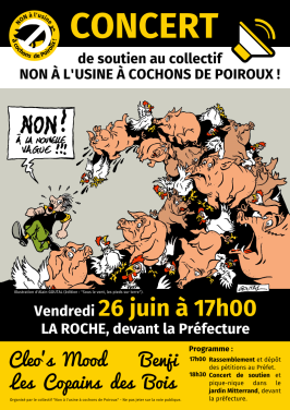 Le collectif « Non à l’usine à cochons de Poiroux » organise un rassemblement le vendredi 26 juin 2015 devant la préfecture de La Roche sur Yon afin de remettre les pétitions au préfet.