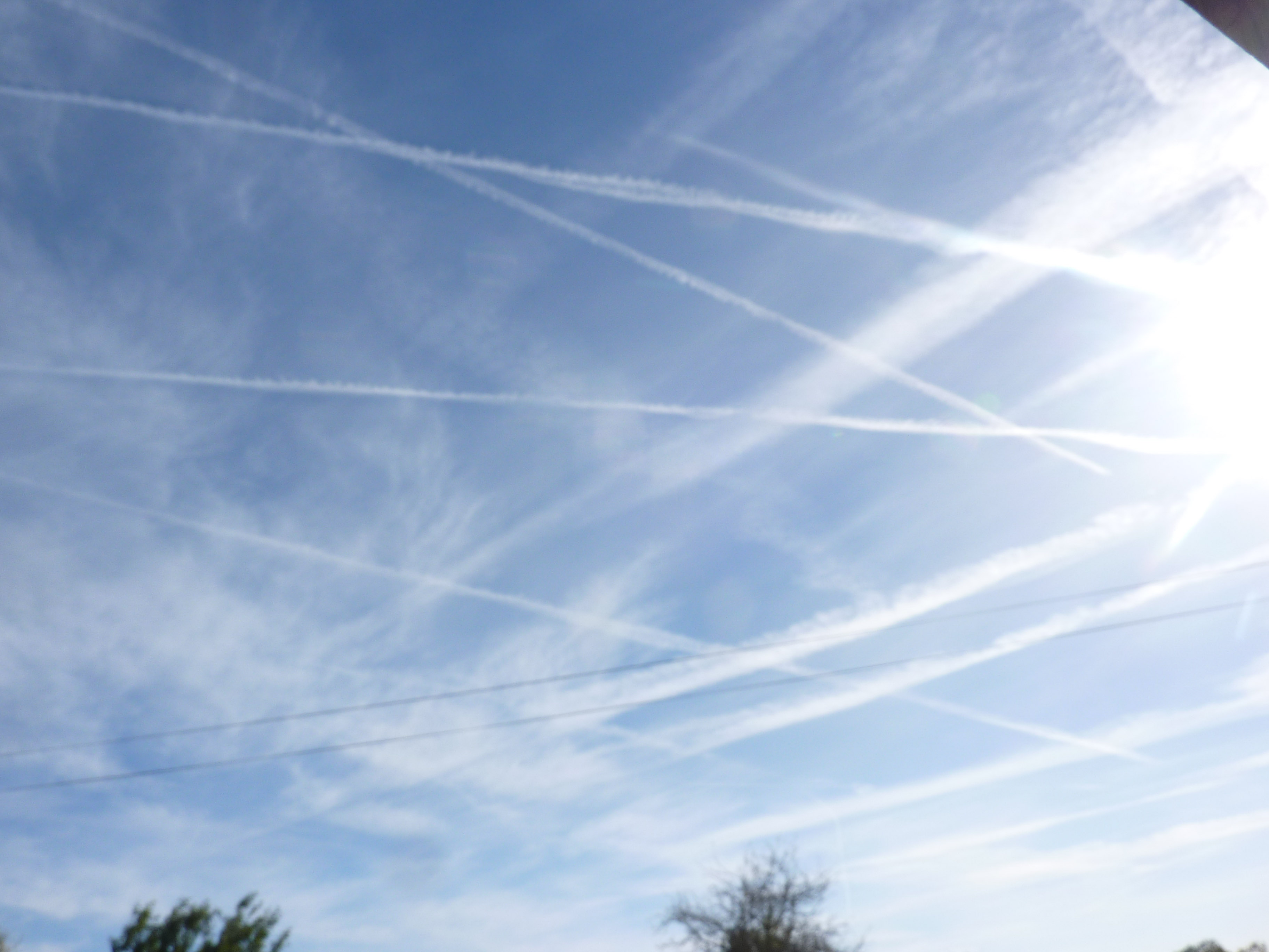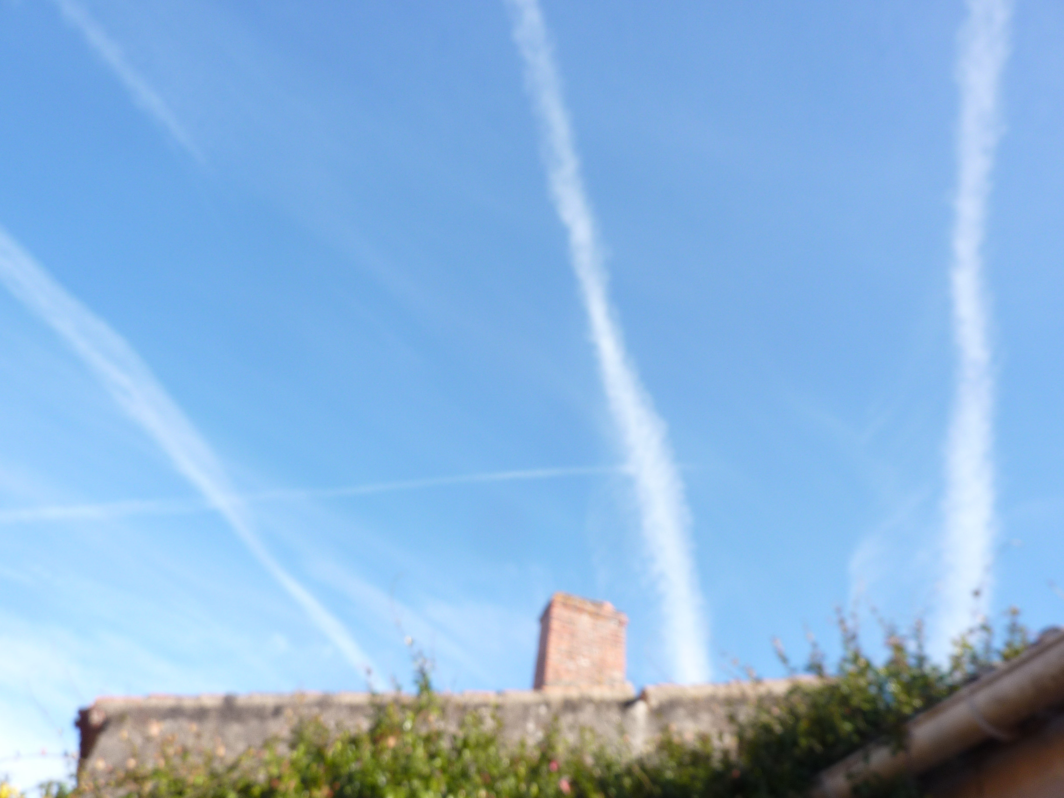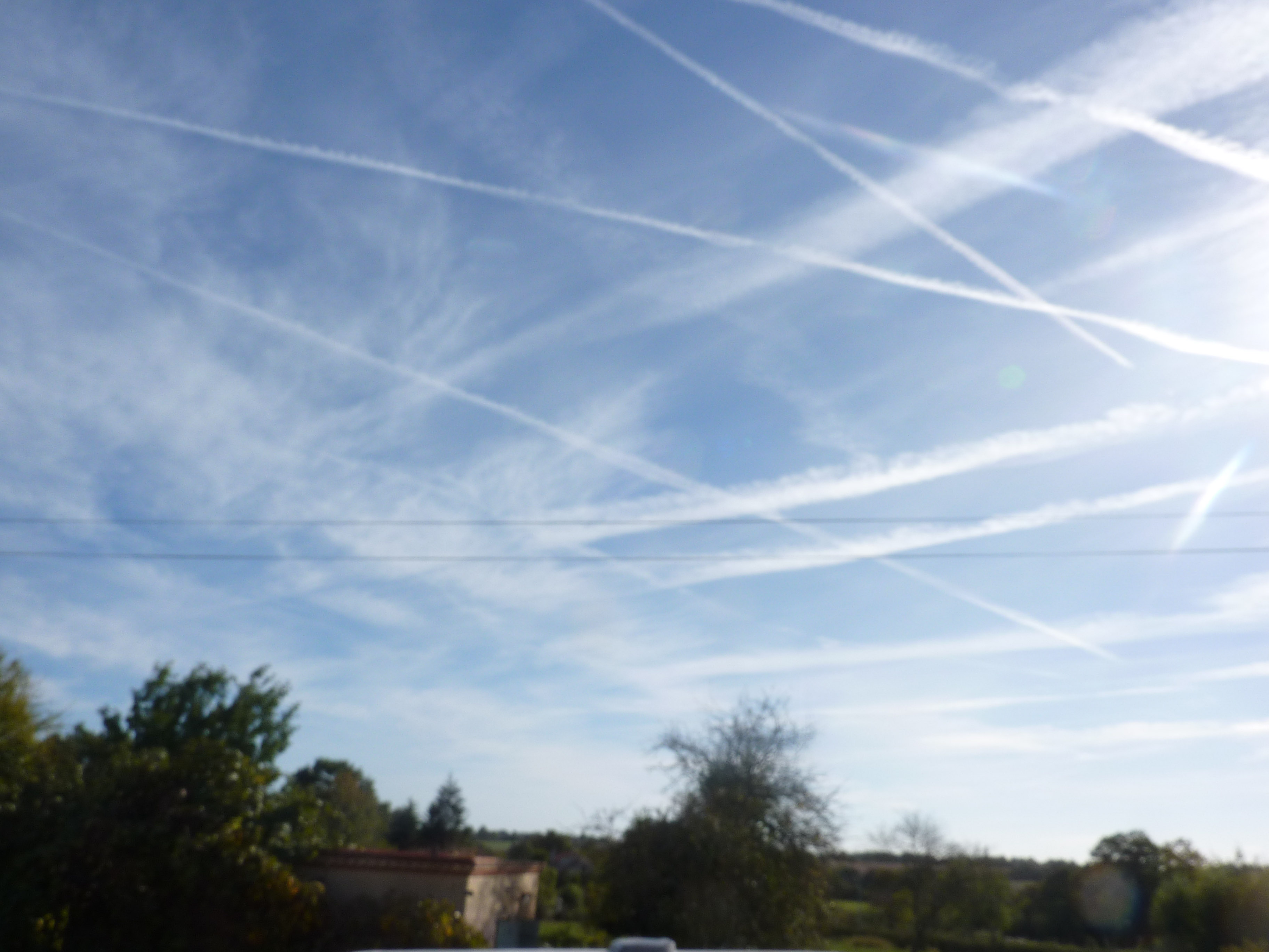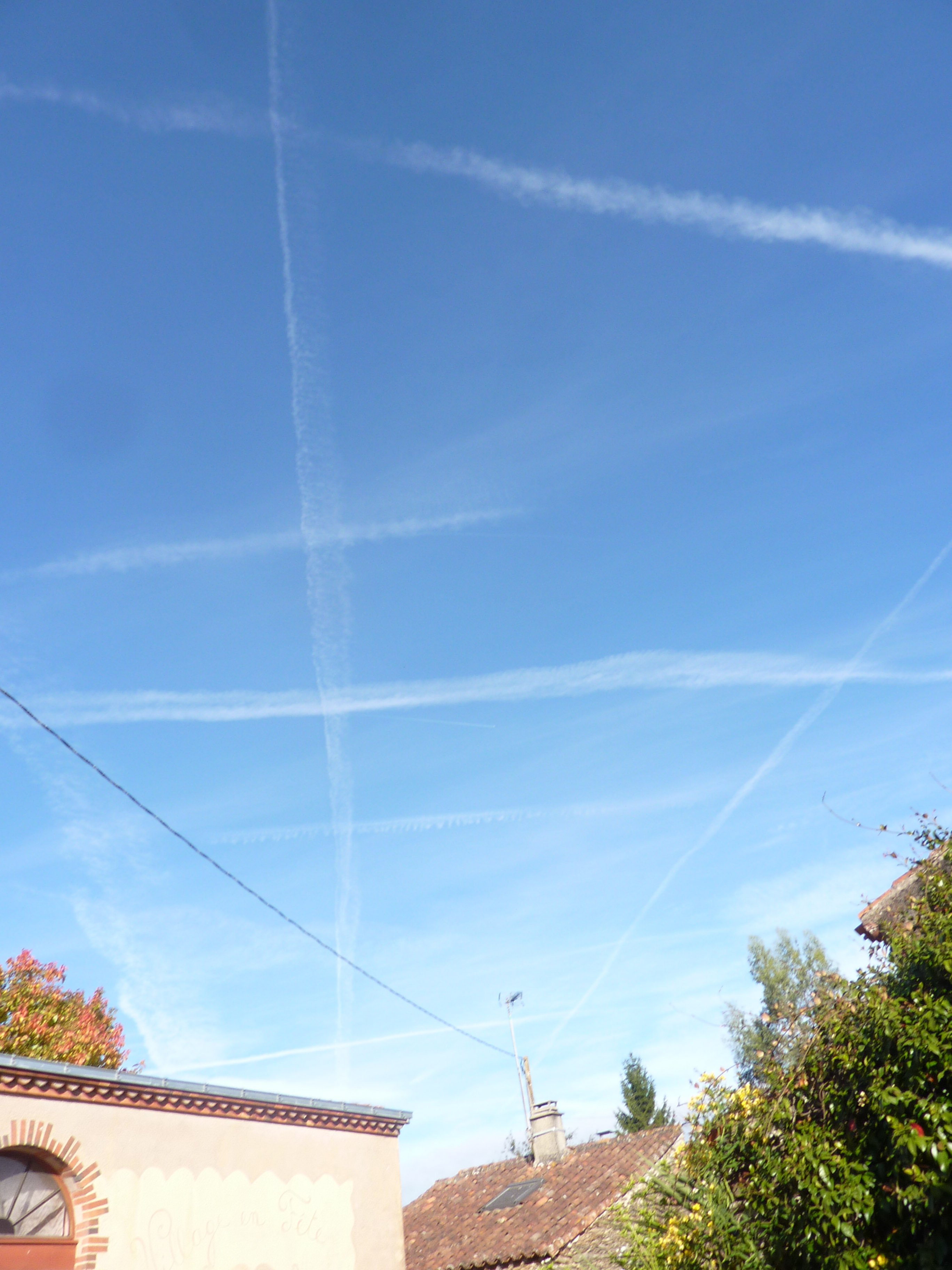 Le ciel qui était bleu s’est ennuagé.Peut-être s’agissait-il d’un simple largage de produits pour faire pleuvoir?Reste que ce mode d’action, pourrait être utilisé pour abrutir ou anéantir des populations entières