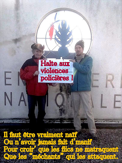 Une foule de trois personnes a manifesté ce jour contre les violences policières devant la gendarmerie de La Roche sur Yon. Sans doute affolés par cette affluence, les pandores ont préféré rester sagement dans leur poulailler mais je dois dire pour être honnête, que c’était à l’heure du goûter. Dans un long discours face à la rue déserte, les trois manifestants ont pris tour à tour la parole pour exprimer leur grande colère et leur profond désaccord avec le refus du gouvernement d’interdire les si décriés flaschball LBD 40 ainsi que les grenades de désencerclement.