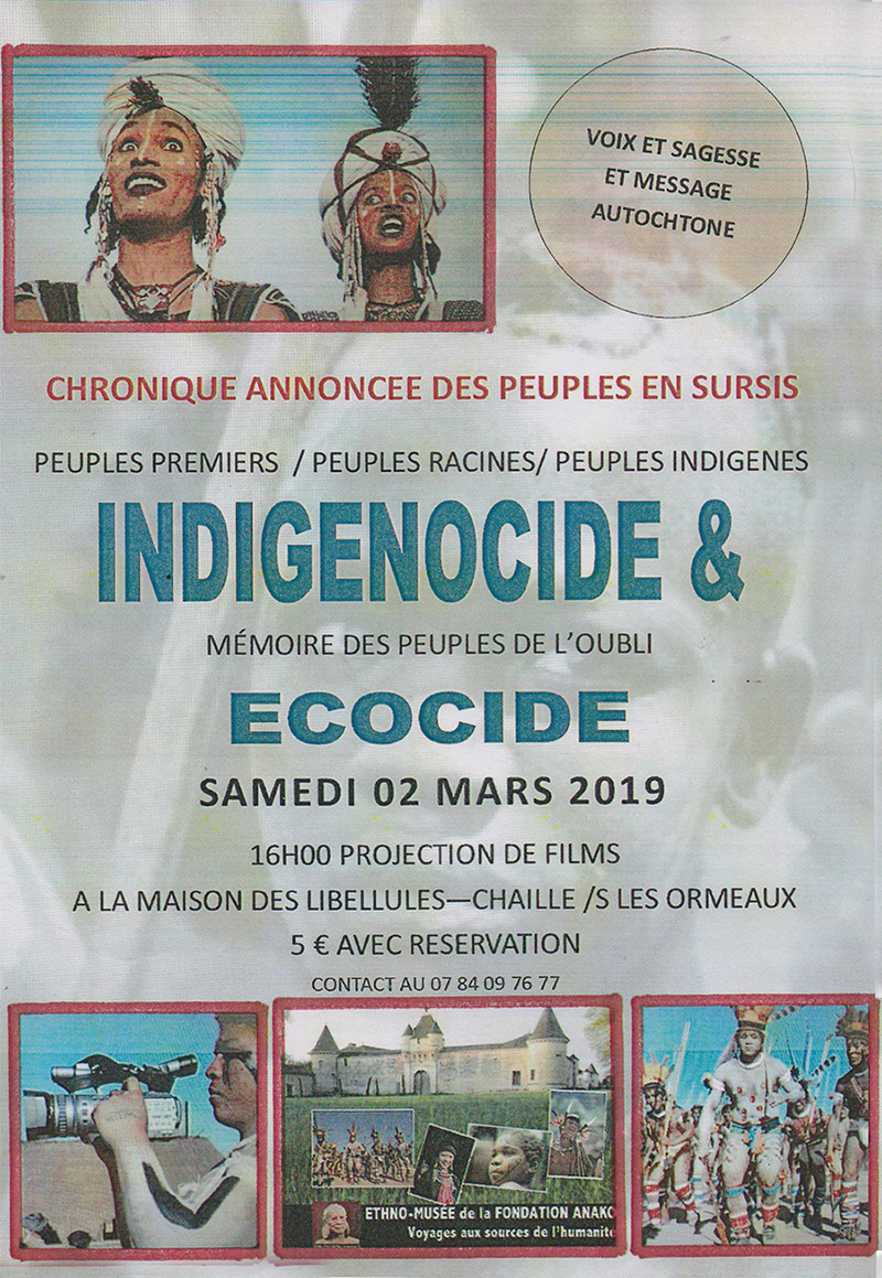 Indigénocide & Écocide Projection de films 21 février 2019 · par Asso La Clé des Champs · dans accueil, Ce sont des amis, allez voir ce qu'ils font, Conférences, infos. · Chronique annoncée des peuples en sursis Mémoire des peuples de l’oubli Projection de films le samedi 2 mars à 16h00, à la Maison des Libellules – Chaillé Sous Les Ormeaux Partager : Partager sur X(ouvre dans une nouvelle fenêtre) X Partager sur Facebook(ouvre dans une nouvelle fenêtre) Facebook J’aime chargement… Sur le même thème