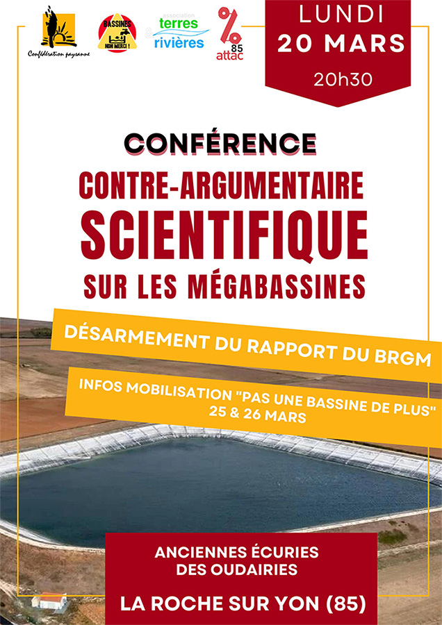 Pour les plus motivés, un week-end de rassemblement anti-bassines ( 24-25-26 mars ) aura également lieu en Poitou ( Melle, Sainte-Soline ou ailleurs ). Covoiturages possibles.